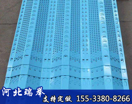 (3)擋風板安裝:擋風抑塵板采用無機非金屬材料模壓*次成型。使用壽命15~20年。使用環境溫度:-40℃至+80℃,連接采用螺釘和壓板固定。擋風抑塵扳的具體尺寸、彎曲度、開孔率應根據堆場的實際情況進行設計。